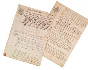 [BAUDELAIRE Charles]. 1821-1867.2 protêts. 16 août 1845 & 7 janvier 1864. 4 pp. grand in-8 en partie imprimée, timbre, cachet. Intéressants documents montrant Baudelaire poursuivi par ses créanciers. 1845, sur une lettre de change de 1500 francs...