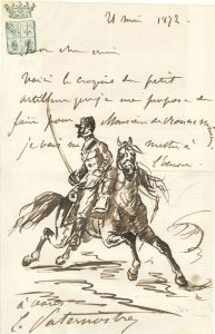 in-fol. Rosa Bonheur, Émile Bourcart (et dessin à la plume), G. Cain, Caran d'Ache, Et. Carjat, Ch. Chaplin, Ph. de Chennevières, Clésinger, A. Courtet (et dessin), Dantan jeune, A. Dauzats, A. Decamps, Ed. Detaille, Ed. Dubufe, Félix Dupuis, Durand-Brager, P.F.L. Fontaine, Gavarni, Ch. Giraud, L. Grandfils, Th. Gudin, L. Heyrault, E. Isabey, Jules Joyant, Eug. Lami, A. Lefèvre-Deumier, Eug. Lequesne, Aug. Mathieu, L.O. Merson, Aimé Millet, Nieuwerkerke, L. Paternostre (lettre avec dessin), J. Pellechet, A. Perignon, A. Preziosi, Aug. Raffet, Th. Richard, Seigneur­gens, A. Stürler, Eug. Trouvé, Th. Veron, Vincent Vidal (avec dessin), E. Viollet-le-Duc, Vital-Dubray, F. Vuagnat (aquarelle), Ad. Yvon, etc. Collection du Baron de BONNEMAINS (tampon à ses armes sur la plupart des lettres). [Henri-Pierre-Édouard de Bonnemains (1821-1898) fut le premier maire du XVIe arrondissement de Paris (1860-1870).]
