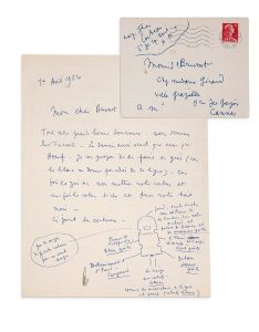1956, 2 pages grand in-4 à l'encre, enveloppe conservée. Lettre au sujet de la décoration de la cha­pelle de Villefranche illustrée de 2 cro­quis originaux: «[...] Les dessins aussi exacts que ceux du Boeuf. Je vous propose de les faire en gris (car le blanc ne donne pas idée de la ligne). Une fois ce gris sec nous mettrons notre couleur et une fois la couleur sèche nous ferons notre trait noir [suit un plan de la chapelle avec indication des sujets et des couleurs] [...] Il faut que les anges se rejoignent de gauche et de droite (second plan) [...] De même derrière et au-dessus de l'autel [suit un dessin d'ange avec indication des couleurs] [...]».