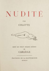 l'ouvrage: COLETTE.- Nudité. Orné de 20 dessins inédits de Car­lègle. S.l., La Mappemonde, 1943, in-4. Reliure plein chagrin noir filets or et gris, double soie bleu pétrole, tranches dorées. Sous emboîtage avec étui. [Liekens]. Exemplaire nominatif destiné à l'éditeur parisien Paul Cotinaud, enrichi d'une lettre autographe signée de Carlègle (Paris, 28 mai 1937) est montée au début du volume avec trois dessins originaux (plume et crayon) dont un a servi à l'illustration de la page de titre.»