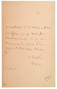 DEGAS Edgar.(1834-1917) B.A.S. Vendredi (s.d.). 1 pp. bi-feuillet in-8. Je mentirais si je criais «Vive la légion...» mais je mentirais aussi si je ne serrais pas la main d'un civil et bon ami comme toi (...).