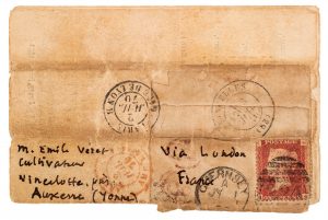 reproduisant le célèbre texte de L'OBEISSANCE PASSIVE: Ô soldats de l'an deux ! ô guerres ! épopées...», avec en-tête un envoi manuscrit: «Applaudissement et remerciement, Victor Hugo-juin 1870». Replié en trois parties, l'envoi, affranchi d'un timbre anglais de 1 p. rouge, comporte les oblitération de départ et d'acheminement de Guernesey le 1er juillet 1870, de passage à Londres, puis à Paris, avec càd d'arrivée à Vincelles (Yonne) le 3 juillet 1870. Intéressant pliage et parcours postal de cet envoi, au moment où Victor Hugo s'apprêtait à regagner Paris, en mettant fin à son exil.