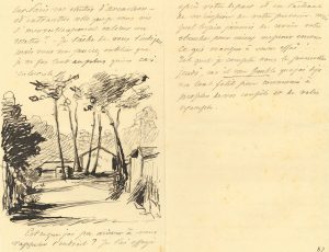 notre exposition [...]. Je n'ai pu encore voir l'expo­sition de peinture, à mon grand regret. Mais je suis tenu ici tout juste à longueur de longe et ne m'écarte guères. Vous devez penser pourtant que le désir de voir votre oeuvre est une attraction de plus vers le Salon»... Il signe: «Votre élève indigne-mais affectionné Nadar». Il ajoute: «Avez-vous, par hazard, emporté sur Paris vos études d'Arcachon-et entr'autres celle que je vous vis si merveilleu­sement enlever un matin ?-Je tâche de vous l'indiquer, mais vous ne sauriez oublier que je ne fus tout au plus qu'un caricaturiste»; et il dessine à la plume sur la moitié de la page le site: quelques cabanes entourées d'arbres:«Je l'ai essayé après votre départ et en tâchant de m'inspirer de votre souve­nir. Mais quel besoin j'aurais de revoir votre ébauche pour mieux mesurer encore ce qui manque à mon essai !»...