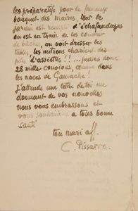 PISSARRO Camille (1830-1903). L.A.S., Paris «204 rue de Rivoli» 21 septembre 1900, à sa femme Julie; 3 pages in-8. Belle lettre inédite de Paris à sa femme, au moment du Banquet des Maires. Il est très bien installé rue de Rivoli, ainsi...