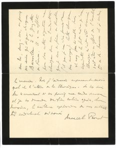 PROUST MARCEL.( 1871-1922).3 L.A.S. à Paul SOUDAY. (1906 et 1922). 3 et 1 p. in-8 sur papier de deuil et 4 pp. in-8. Correspondance au célèbre critique littéraire Paul Souday (1869-1929), auteur d'une biographie de Proust. - 45, rue de Courcelles...