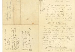 «me faire faire par un menuisier, ceci, très bas, de la grandeur de notre lit [dessin d'un sommier sur pieds courts]. 20 centimètres de pieds pas plus, des sangles dans le milieu, et deux matelas en varek ou quelque chose d'analogue, pour que ça ne se mange pas aux vers, le tout recouvert en toile comme celle que tu as achetée pour tes rideaux, et une garniture rouge». Il dessine aussi «le profil du matelas», puis «l'ensemble», en haut à gauche dans la marge. Il s'inquiète de la chaleur à Paris, lui dit de prendre la pendule qui est dans son atelier rue Saint-Georges, et refait un dessin du cadre du sommier en bois, précisant qu'il faut «rajouter deux coussins»... Au dos, il ajoute, en recevant la lettre d'Alice: «Voilà ce que c'est de mettre des corsets ridicules et de mal se tenir. J'espère qu'après cette leçon je te trouverai 18 ans à mon retour».»