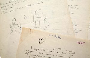 SAINT-EXUPÉRY Antoine de (1900-1944) MANUSCRIT autographe (brouillon) avec 3 DESSINS, [Sur la télévision, vers 1939]; 5 pages in-4 ornées de 3 croquis à l'encre. Intéressant manuscrit sur l'avenir de la télévision. [C'est à partir du début...