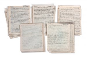 peu effrangés avec quelques déchirures et petits manques), plusieurs avec son cachet encre, une enveloppe. Importante correspondance sur son hôpital de Lambaréné et sur ses livres, adressée à son ami, biographe, traducteur et éditeur américain Charles R. Joy, également responsable de programmes de secours humanitaires. [Charles Rhind JOY(1885-1978), pasteur unitarien, engagé dans les secours humanitaires de 1940 à 1954 comme directeur exécutif de l'Unitarian Service Committee, directeur européen et directeur associé de la Save the Children Federation, consultant exécutif pour les affaires africaines pour la C.A.R.E. Mission, etc., rendit visite au Dr Schweitzer à Lambaréné en 1947. Les deux hommes se lièrent d'amitié. Auteur de nombreux livres d'introduction aux pays et aux peuples (Getting to know the Sahara; Africa: a Handbook for Travelers, etc.), Joy fut aussi le traducteur en anglais des oeuvres de Schweitzer, co-auteur avec Melvin Arnold de The Africa of Albert Schweitzer (1948), et auteur de Music in the Life of Albert Schweitzer (1951). Nous ne pouvons donner ici qu'un aperçu de cette riche correspondance.] Lambaréné 19 octobre 1946. Il raconte qu'étant allé dans son canoë chercher le courrier venant de Port Gentil, il a appris en même temps que l'hôpital avait largement dépassé son crédit à la Banque Commerciale Africaine qui réclamait 124.752 F (alors qu'il ne lui restait à la Banque de l'Afrique Occidentale que 30.000 F destinés aux dépenses courantes: «nourriture des nombreux malades indigènes, paiement des salaires des infirmiers et de travailleurs indigènes, etc.»), mais qu'une nouvelle banque avait reçu 388.822 F pour l'hôpital, provenant de l'Unitarian Service Committee U.S.A. ! Il a acheté plusieurs kilos de beurre du Cameroun pour fêter cela, et l'infirmière qui conduit le ménage lui a présenté une liste d'articles; «en premier lieu des tissus pour le linge de la salle d'opération»... Il a acheté aussi 2.000 kilos de ciment, et assisté d'un vieux maçon, il a construit devant l'hôpital un quai d'accostage, qui permettra aux bateaux d'accoster en toute saisons, le niveau du fleuve variant de plus de 6 mètres entre les hautes et basses eaux: «je suis redevenu maçon comme en 1925, 26 et 27 quand je construisais l'hôpital». Il remercie de cet énorme secours alors que l'hôpital traverse des temps bien difficiles. «Je me consacre surtout aux ulcères phagédéniques, aux malades de coeur, au traitement des lépreux et à l'urologie. Je me consacre aussi particulièrement à maintenir la pharmacie en bon ordre»... Avec les deux nouveaux médecins, il fait beaucoup de chirurgie, mais il déplore l'enchérissement de la nourriture journalière des patients (bananes, manioc, riz)... Il donne des précisions sur le personnel infirmier, et charge Joy de remercier les membres du Committee... «Pendant que je vous écris dans la nuit, une petite antilope orpheline que nous élevons au biberon et qui habite ma chambre se promène sous ma table et de temps en temps frotte sa tête contre mes genoux pour demander une caresse»... 12 juillet 1947. Lettre en deux parties, «Affaires» et «Affaires littéraires»: coordonnées des transporteurs à son adresse, et du médecin qui le renseigne sur les médicaments américains, notamment contre la lèpre; puis il avoue sa tristesse, et celle de son entourage, après le départ de Joy de Lambaréné. Détail des modifications à apporter à son anthologie... 1er août. Remerciement pour un envoi de 25.000 Ffrancs: «vous savez comment est ma vie... et elle était particulièrement dure dans ces semaines après votre départ. J'avais beaucoup à faire à l'hôpital»... Il parle aussi de son travail au jardin et à la conduite d'eau, et espère qu'il a reçu ses remarques sur l'anthologie. «Les deux photographies que le Dr Goldschmid a fait de M. Arnold, vous et moi sont admirablement réussies»... 2 novembre. Remerciements pour l'envoi de photos qui ont émerveillé tout le monde, et les nouvelles du livre Albert Schweitzer in Africa: «Il paraît que vous avez été assis à ma table de travail à Gunsbach en rédigeant les premiers chapitres... [...] Ma vie est à présent encore plus remplie et plus difficile que quand vous étiez là. [...] Et la main ne veut pas marcher du tout»... Puis il parle longuement du projet de traduction de sa thèse de médecine en 1912, Die Psychiatrische Beurteilung Jesu (contrats, droits, prélèvements par l'Office des réparations)... 18 décembre (3 lettres du même jour). Il demande d'envoyer des colis aux nécessiteux de Königsfeld, zone d'occupation française où se trouve actuellement sa femme... Il explique le nouvel emploi du temps des infirmières, qui va lui permettre de «mettre un peu d'ordre dans le chaos où je vivais depuis le commencement de la guerre»; le traitement d'une quarantaine de lépreux par le Dr Brad, les opérations du Dr Kopp... Il parle aussi de ses animaux, dont l'antilope Pamela... Il insiste pour qu'on annonce sobrement son anthologie, sans superlatifs, comme dans le Christian Register: «je souffre quand on parle de cette façon de moi. [...] Personne de nous ne sait qui aux yeux de Dieu et de notre Seigneur Jésus-Christ est “the greatest soul in Christendom”. [...] je n'ai aucun droit à cette qualification. Dieu m'a donné des dons, une santé robuste, de l'équilibre mental, et par les paroles du Christ j'ai connu que je devais les employer pour l'avènement du Royaume de Dieu, ce que j'essaie de faire en toute humilité. [...] Combien est légère la croix que je porte moi pour suivre le Christ... la croix qui ne consiste qu'en fatigue que j'endure pour faire mon oeuvre»... 12 février 1948 (3 lettres). Il se réjouit que la première édition de l'anthologie soit épuisée; il la lit avec plaisir. Il attend le récit du séjour de Joy à Lambaréné... Il demande des secours pour son ancien él