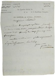 Barthélémy-Catherine JOUBERT (1769-1799) vaillant général de la Révolution, tué à Novi. L.A.S., [janvier 1797], au général Belliard ; demi-page in-4 à son en-tête Le Général de division, Joubert (bord gauche rogné).