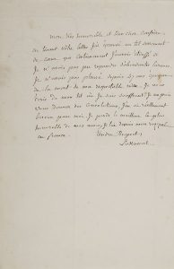 22 Brumaire XII [14 novembre 1803], à Nicolas Frochot, Préfet de la Seine, demande d’audience particulière pour une affaire « étroitement liée aux intérêts de la chose publique » ; il rappelle ses titres : « de l’Institut de France, de l’Athénée de Paris, professeur à l’école centrale de la Rue St Antoine ».{CR} [20 juin 1844], à son confrère Isidore Geoffroy Saint-Hilaire. Condoléances pour la mort de son père, le naturaliste étienne Geoffroy Saint-Hilaire. Il a été si éprouvé en lisant sa lettre que « certainement j’aurais étouffé si je n’avais pas pu répandre d’abondantes larmes. Je n’avais pas pleuré depuis 47 ans époque de la mort de ma respectable mère ». Souffrant, il écrit depuis son lit et est inconsolable : « Je perds le meilleur le plus honorable de mes amis, je lui devais mon rappel en France »... [C’est grâce à ses démarches que Lakanal avait pu rentrer en France après un exil de 22 ans en Amérique.]{CR} On joint une plaquette Vie et Œuvres de Joseph Lakanal et une enveloppe 1er jour du timbre à son effigie (2 juin 1962).
