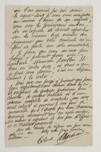 4 juin 1903, [à M. Boullier]. Violente lettre de remontrances, après avoir été abusé par son correspondant qui s’est mis par cynisme dans une mauvaise posture : « vous seriez en droit de me prendre pour un jean foutre et un naïf renforcé si je tentais la moindre démarche pour vous en sortir, sans compter que ma bonté à laquelle vous avez l’audace de faire un nouvel appel pourrait parfaitement être qualifiée par d’autres de complicité. J’ai essayé, sans vous connaître et sur simple appel de détresse, de vous faire un peu de bien et de vous aider dans la dure lutte pour la vie – vous en avez criminellement abusé et vous m’avez mis dans le cas de pouvoir être considéré comme responsable des conséquences que votre habileté totalement dénuée de scrupules a prétendu tirer de ma recommandation et de la possession de lettres que vous teniez de mon extrême condescendance »... Il termine : « Tachez de refaire un peu mieux votre vie ou...allez vous faire pendre ailleurs ».{CR} À son amie Mme Lauth. Il envoie une photographie prise par un artiste japonais à Vladivostok lors de son retour de Pékin à Paris : « J’étais alors chef d’état major du Corps expéditionnaire français en Chine. Il faisait dans les 30 degrés au-dessous de zéro, et l’enthousiasme de nos chers alliés m’avait préalablement démuni de toutes mes coiffures afin de se partager les boutons et les galons, d’où la tenue composite et l’allure légèrement cosaque »... {CR} On joint un feuillet recto-verso au crayon, plans dessinés et légendés représentant la région où se trouvait Marchand en Chine.