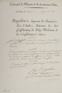 24 février 1810. Nomination de Seyssel comme « maître des cérémonies » de la Maison de l’Impératrice (Marie-Louise). « Il sera particulièrement chargé des audiences de cérémonie qui auront lieu dans l’appartement de l’Impératrice, et d’indiquer à chacun des officiers ou dames de son service les fonctions qu’ils doivent remplir » ; avec lettre d’envoi.{CR} 27 novembre 1810. Nomination de Six Van Osterlbeck comme Intendant des biens de la Couronne dans le Gouvernement de Hollande ; avec lettre d’envoi.