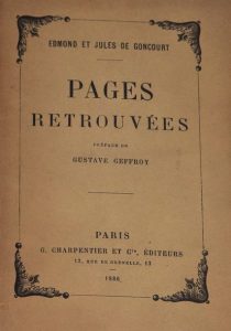 Pages retrouvées. Paris, G. Charpentier, 1886. In-12, broché, chemise et étui modernes. Édition originale de ce recueil préfacé par le critique d'art Gustave Geffroy, comprenant des études sur Gautier, Mérimée et Libri, Daudet, Barye, Decamps, Naples, Alger...