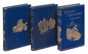 Captains Courageous. A Story of the Grand Banks. Londres, Macmillan, 1897. In-12, bradel percaline bleue, décor doré sur le plat supérieur et le dos, tranches dorées (Reliure de l'éditeur). Édition originale de Capitaines courageux, un des grands romans d'aventure de Rudyard Kipling.