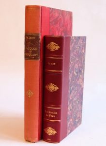 On joint, du même : Le Moulin du Frau. Histoire du meunier périgordin Hélie Nogaret. Préface d'Alcide Dusolier. Paris, Dreyfous et Dalsace, s.d. [1895]. Petit in-8, demi-veau bordeaux, dos à nerfs orné, couvertures (Goudelier). Édition originale du premier roman d’Eugène Le Roy. Les éditions postérieures ont été revues afin d’être moins « patoisantes ».
