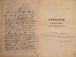 Antigone. Tragédie de Sophocle. Paris, Furne et Cie, 1844. In-12, bradel percaline grise, pièce de titre brune, non rogné, couverture (Petitot). Édition originale de cette traduction.