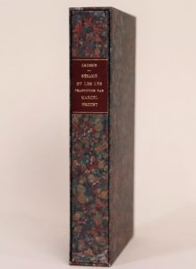 Sésame et les Lys. Des Trésors des rois. Des Jardins des reines. Paris, Société du Mercure de France, 1906. In-12, broché, chemise et étui cartonnés modernes. Édition originale de la traduction, avec notes et préface, de Marcel Proust de deux conférences de l'historien de l'art, peintre et sociologue anglais John Ruskin, consacrées à la lecture et à l'éducation des jeunes filles.