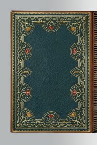 doublure de maroquin bleu gris ornée d'une large dentelle aux contours irréguliers avec motifs floraux mosaïqués en rouge et citron, garde de soie brochée, tranches dorées sur témoins, couverture et dos, étui (S. David).