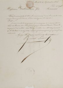 Il les remercie d’avoir bien voulu s’occuper de son port d’armes, et les crédite pour le coût de 15 francs. « Je vous écris de la campagne et je ne sais pas si je vous ai dit de vous rembourser sur Paris pour ce que je reste vous devoir. Dans le cas que je l’aie oublié, vous tireriez ce solde sur Mrs Baguenault et Cie de Paris à courts jours, en m’en prévenant pour que je confirme votre avis »… Rare.