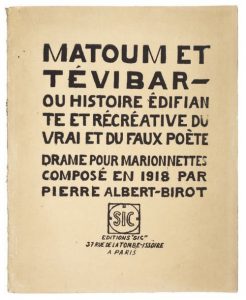 ALBERT BIROT Pierre MATOUM ET TEVIBAR. Histoires édifiantes et récréatives du vrai et du faux poète. Paris, Editions Sic, 1919. In-8 carré, broché.