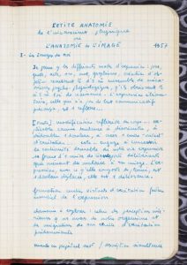 Important carnet autographe à l'encre bleue et verte de Bernard Noël, de notes consacrées au livre d'Alain Jouffroy sur Hans Bellmer, aux lettres de Joë Bousquet à Bellmer, aux dessins et à l'anatomie de l'image de Bellmer, à l'Homme jasmin de Unica Zurn, à l'Histoire d'une petite fille de Laure, à Mon corps et moi de René Crevel, à Henri Michaux d'Alain Jouffroy etc.