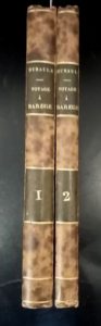 Paris, Imprimerie de Didot jeune, 1796, 2 vol. in-8, 347 pp. et [4]-207-55 pp., table des matières reliée entre la fin du Voyage et le début de la Préface à la traduction de Juvénal, qui se présente en pagination séparée "in fine", bradel papier marbré (reliure postérieure). Dos décoloré. Page de garde du tome I trouée. Ex-libris armorié.