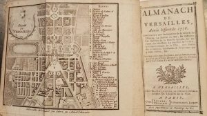 contenant une description de la ville & du Château. La Maison du Roi, ses officiers. Les Maisons de la famille royale Versailles, chez Blaizot, Paris, chez Valade, Deschamps, s. d, (1776), in-16, 301-[3] pp., tissu fleuri (reliure du XIXe).