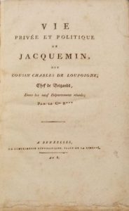 Très rare opuscule sur Charles-François Jacquemin (1761-1799), aventurier et chef de partisans qui avait commencé sa carrière comme soldat au service de la cause "patriote", avant de passer aux Autrichiens.