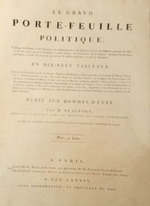 Le Grand porte-feuille politique, à l'usage des princes et des ministres, des ambassadeurs et des hommes de lois, des officiers généraux de terre et de mer, ainsi que de la noblesse, du haut clergé, des financiers, des voyageurs, amateurs de sciences politiques ; et enfin de tous ceux qui suivent la carrière politique, ou qui s'y destinent ; en dix-neuf tableaux, contenant la constitution actuelle des Empires, Royaumes, Républiques, et autres principales souverainetés de l'Europe