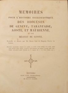 Mémoires pour l'histoire ecclésiastique des diocèses de Genève, Tarantaise, Aoste, et Maurienne, et du décanat de Savoye. Recüeillis et dressés par Mr Besson curé de Chapeiry, diocèse de Genève. Moutiers, Marc Cane, 1871, in-4, VIII-498 pp., [3] ff. n. ch. (Liste des souscripteurs), basane fauve racinée, dos à nerfs orné de filets et fleurons dorés, pièce de titre rouge, tranches rouges (reliure de l'époque). Bon exemplaire.