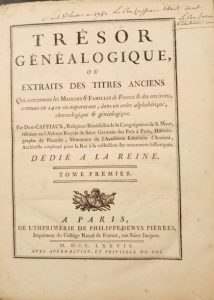 Trésor généalogique, ou Extraits des titres anciens qui concernent les maisons & familles de France & des environs, connues en 1400 ou auparavant ; dans un ordre alphabétique, chronologique & généalogique. Dédié à la Reine. Tome premier [seul paru]