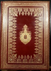 Bassano, tipo-litografia Antonio Roberti, 1881-1885, 2 vol. in-4., texte sur deux colonnes, avec un portrait-frontispice sous serpente (Vincenzo Stefano Breda), des figures dans le texte et 91 planches et cartes, la plupart à double-page, veau rouge, dos lisses ornés et muets, très riches encadrements de filets et guirlandes dorées sur les plats, grande plaque à décor floral mosaïqué au centre des plats, armes au centre des premiers plats, tranches dorées, larges dentelles intérieure, gardes doublées de tabis rouge (reliure du XXe siècle). Bel exemplaire. Ces deux albums, tirés à 800 exemplaires, étaient destinés à la présentation des réalisations de la Société vénitienne de constructions publiques