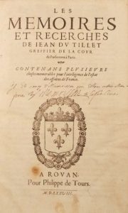 Les Mémoires et recherches de Jean Du Tillet, Greffier de la Cour de Parlement à Paris. Contenans plusieurs choses mémorables pour l'intelligence de l'estat des affaires de France