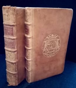 Londres, et se trouvent à paris, Duchesne, 1754-1758, 5 tomes en 2 volumes in-12, veau blond, dos à nerfs cloisonnés et fleuronnés, pièces de titre et de tomaison rouge et fauve, encadrement d'un filet à froid sur les plats, armes au centre, filet doré sur les coupes, tranches rouges (reliure de l'époque). Début de fente aux mors du second volume, coins usés, mais bon exemplaire.