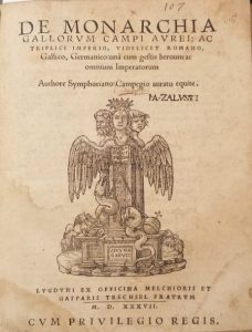 De Monarchia / Gallorum Campi aurei: ac / triplici imperio, videlicet Romano, / Gallico, Germanico : una cum gestis heroum ac / omnium Imperatorum. / Authore Symphoriano Campegio aurato equite