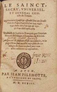 Le Sainct, sacré, universel, et général Concile de Trente légitimement signifié & assemblé sous nos saincts Pères les Papes Paul III l'an 1545-1546-1547, Jules III l'an 1551 & 1552, & Pius IIII, 1562-1563. Traduict de Latin en François, par Gentian Hervet, d'Orléans, chanoine de Rheins. Augmenté de plusieurs choses mentionnées, en la page VI mesmes en ceste impression du catalogue des livres censurez avec nouvelles additions & appendices