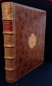 Paris, Schlesinger frères, 1874, in-4, [8]-486 pp., avec, in fine, 6 tableaux généalogiques à double page monté sur onglets, veau fauve marbré, dos à nerfs cloisonné et orné à l'imitation, pièce de titre rouge, encadrement de triple filet doré sur les plats, armes poussées au centre des plats, double filet doré sur les coupes, tranches rouges, guirlande intérieure (reliure de l'époque). Anecdotiques rousseurs.