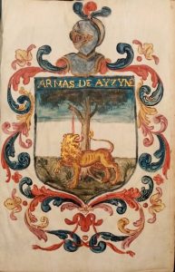 Précédée d'une grande peinture héraldique de las "armas de Ayzyne", sous serpente de tissu bleu