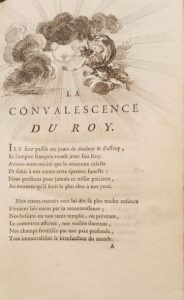 Recueil à la gloire de Louis XV orné d'un frontispice allégorique gravé par Cochin, d'une vignette gravée sur la page de titre et d'une vignette allégorique sur la page du premier texte intitulé La Convalescence du Roy.