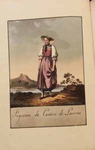 Collection de costumes suisses, d'après les dessins de Reinhardt. Chaque planche représente un costume avec une vue prise sur les lieux ; à laquelle on a joint la description en anglais et en français / A Collection of Swiss costumes in miniature, designed by Reinhardt