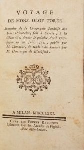 Voyage de Mons. Olof Torée Aumonier de la Compagnie Suedoise des Indes Orientales, fait à Surate, à la Chine, &c depuis le premier avril 1750 jusqu'au 26 juin 1752, publié par M. Linnaeus, & traduit du Suédois par M. Dominique de Blackford