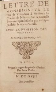 Lettre à Messieurs les Consuls de Nismes sur la nouvelle d'une entreprinse faicte par les Espagnols sur la ville de Venise. Avec la punition des traistres. De Turin le 2. jour de juin 1618
