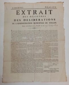 7. [AFFICHE - TOULON] - Extrait des Registres des délibérations de l'administration municipale de Toulon. Séance extraordinaire du 24 Fructidor au soir an Six Républicain (ajouté à la plume). A Toulon, chez la Veuve Surre, s.d., 63 x 49.