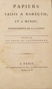 13. [AGENCE d'AUGSBOURG] - Papiers saisis à Bareuth et à Mende, département de la Lozère. Publié par ordre du gouvernement. A Paris, de l'Imprimerie de la République, Ventôse, an X, in-8, VII-387 pp., bradel papier bleu (reliure moderne).