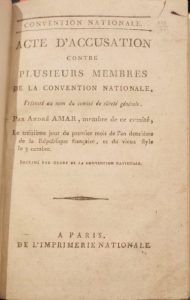 17. AMAR (André). Convention Nationale. Acte d'accusation contre plusieurs membres de la Convention Nationale, présenté au nom du Comité de sûreté générale, le treizième jour du premier mois de l'an deuxième de la République française, et du vieux style le 3 octobre. Paris, Imprimerie Nationale, s.d., (1793), in-8, [2]-54 pp., cartonnage Bradel de papier marbré, dos lisse, pièce de titre cerise en long (Lavaux).