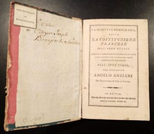 21. ANZIANI (Angelo). La Perfetta democrazia, ossia La Costituzione francese dell'anno ottavo esposta, e dimostrata ragionevole in tutti i suoi articoli per la maggior parte confrontati con quelli dell'anno terzo, dal cittadino Angelo Anziani, del dipartimento di Golo in Corsica. Bastia, Batini, an IX, (1801), in-8, 325 pp., f. 293-94 usé avec perte de quelques lettres, demi-vélin modeste, tranches mouchetées de rouge (reliure de l'époque). Coupes très abîmées.