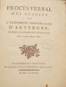 38. [AUVERGNE] - Procès verbal des séances de l'Assemblée provinciale d'Auvergne, tenue à Clermont-Ferrand, dans le mois d'août 1787. Clermont-Ferrand, Antoine Delcros, 1787, in-4, 51 pp., demi-chagrin violine, dos à nerfs muet, orné de filets et pointillés dorés, double filet à froid sur les plats, tranches mouchetées (rel. du XIXe). Dos passé et frotté, mais bon exemplaire.