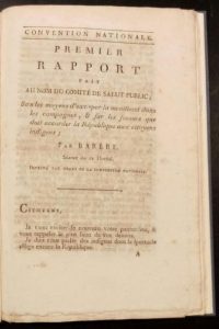BARÈRE DE VIEUZAC (Bertrand). Premier Rapport fait au nom du Comité de Salut Public, sur les moyens d'extirper la mendicité dans les campagnes, & sur les secours que doit accorder la République aux citoyens indigens. Paris, de l'Imprimerie Nationale, (1794), in-8, 54 pp., bradel papier bleu (Ateliers Laurenchet).