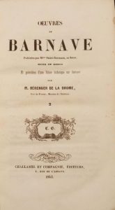 44. BARNAVE (Antoine-Pierre-Joseph). OEuvres. Mises en ordre et précédées d'une notice historique sur Barnave par M. Bérenger de la Drôme. Paris, Jules Chapelle et Guiller, 1843, 4 tomes en 2 vol. in-8, CXL-288-408-390-424 pp., portrait, 2 fac-similés, demi-basane verte, dos lisse, filets dorés (reliure de l'époque). Usures aux mors et aux coiffes. Rousseurs. Le tome 1 a été relié après le tome 2.
