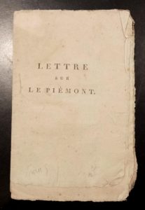 BONAFIDE (Francesco). Lettre sur le Piémont, ou réponse aux observations d'un Piémontais, sur la réunion cette contrée à la République française. A Paris, de l'imprimerie de Rabaut, an VII, in-8, 35 pp.